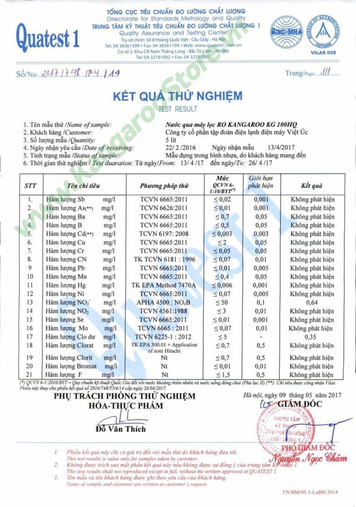 GIẤY CHỨNG NHẬN NƯỚC SAU LỌC